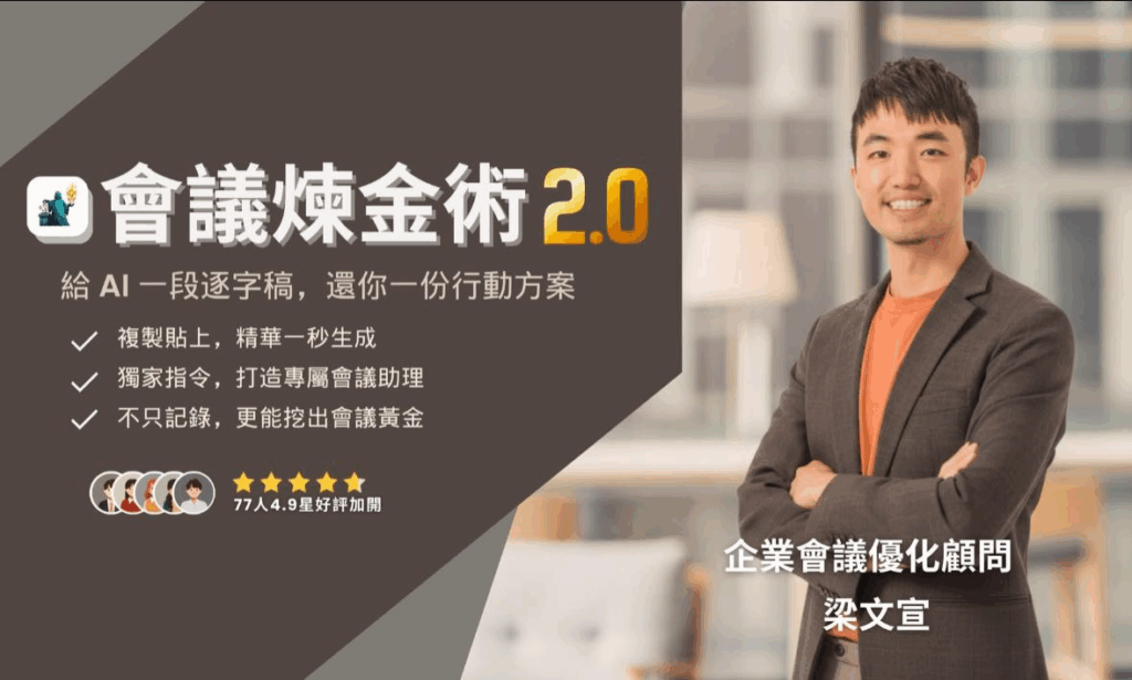 - AI 會議煉金術工作坊:三步驟幫你把任何冗長的會議,變成精要有效的會議紀錄,每週幫你省下 3-5 小時的
