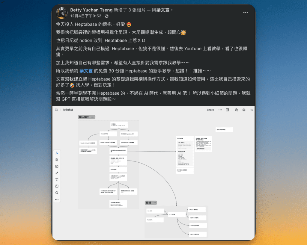文宣幫我建立起 Heptabase 的基礎邏輯架構與操作方式,讓我知道如何使用,這比我自己摸索來的好多了🤣 找人學,做對決定!