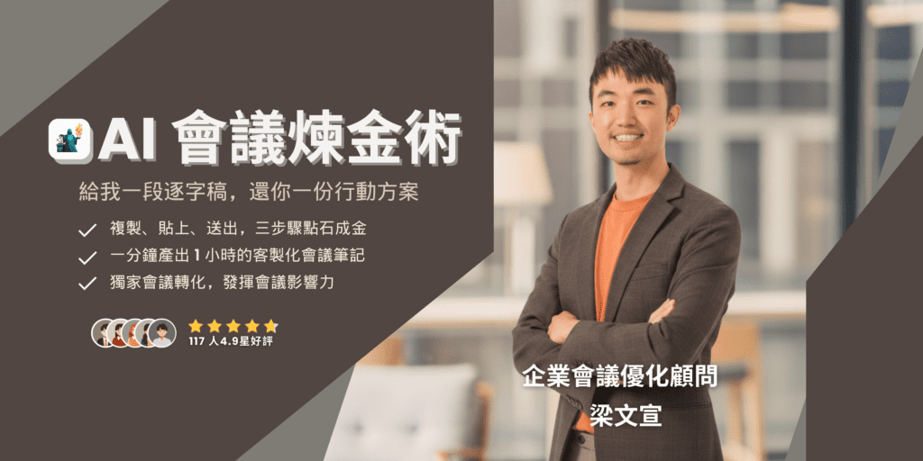 離職創業後,我開了 300+ 場會議,每場會議都燒掉我寶貴的時間成本。於是我研究了一套「會議煉金術」系統,幫助創業者用 AI 把開不完的會變成果,已協助 140+ 學員,每週省下 3–5 小時。