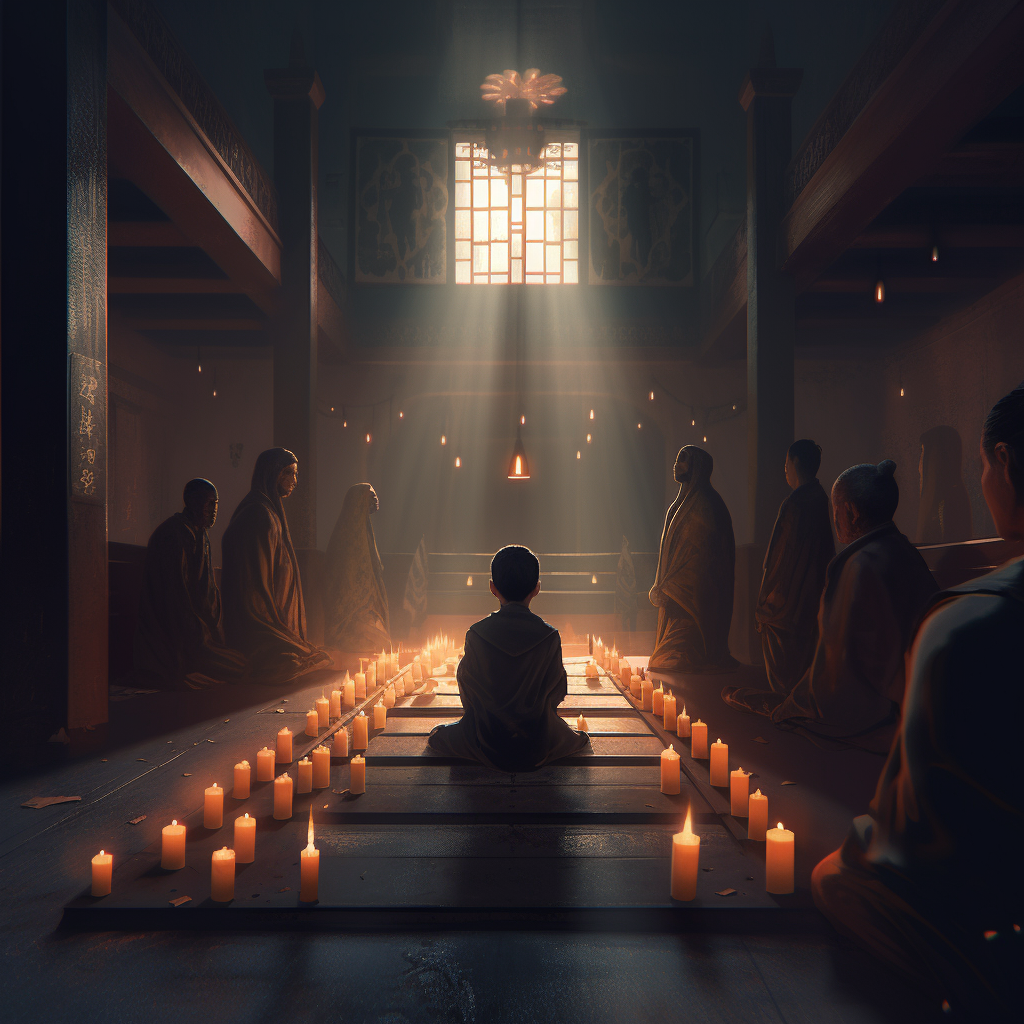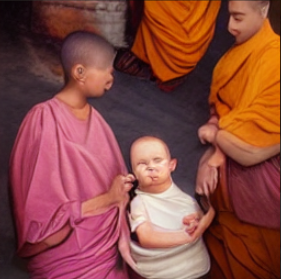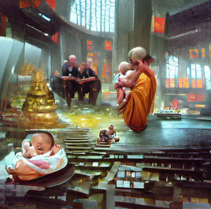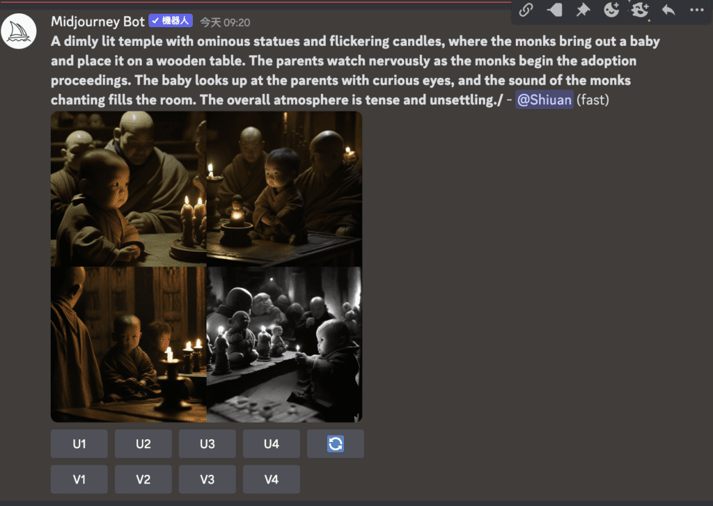 最後,如果有人有MidJourney權限,再請您幫我輸入”1 baby in temple with 4 monks and parents”,我想看看傳說中「可以讓設計師失業」的AI,到底有多強。