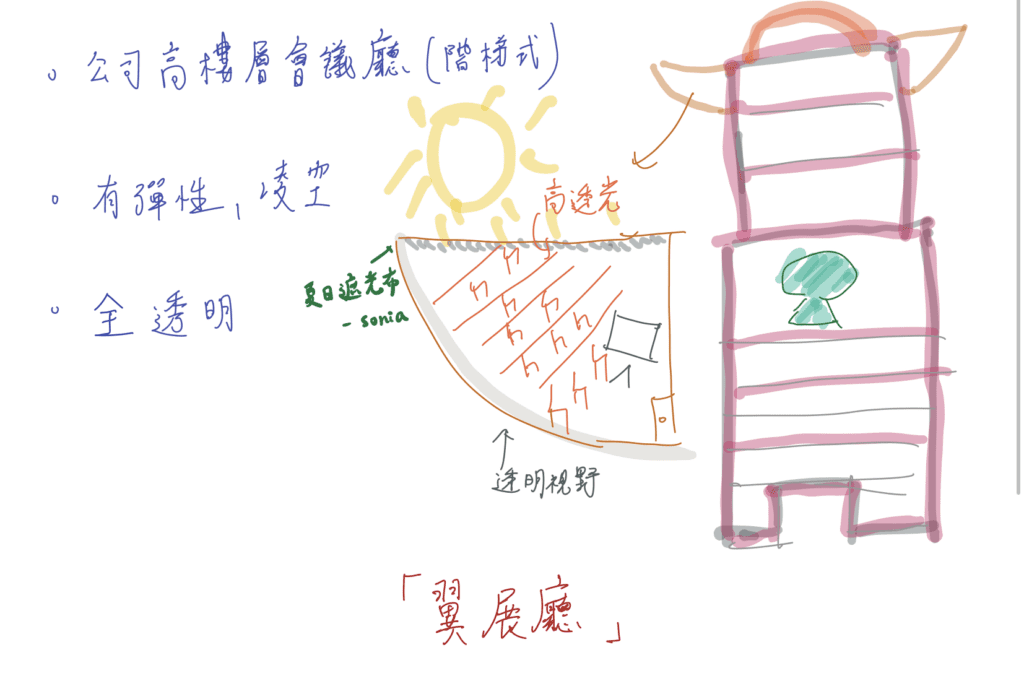 e.g. 2020/11/29 夢到公司頂樓改裝成一個新形態的建築設計,我取名為「翼展廳」,詳見下圖