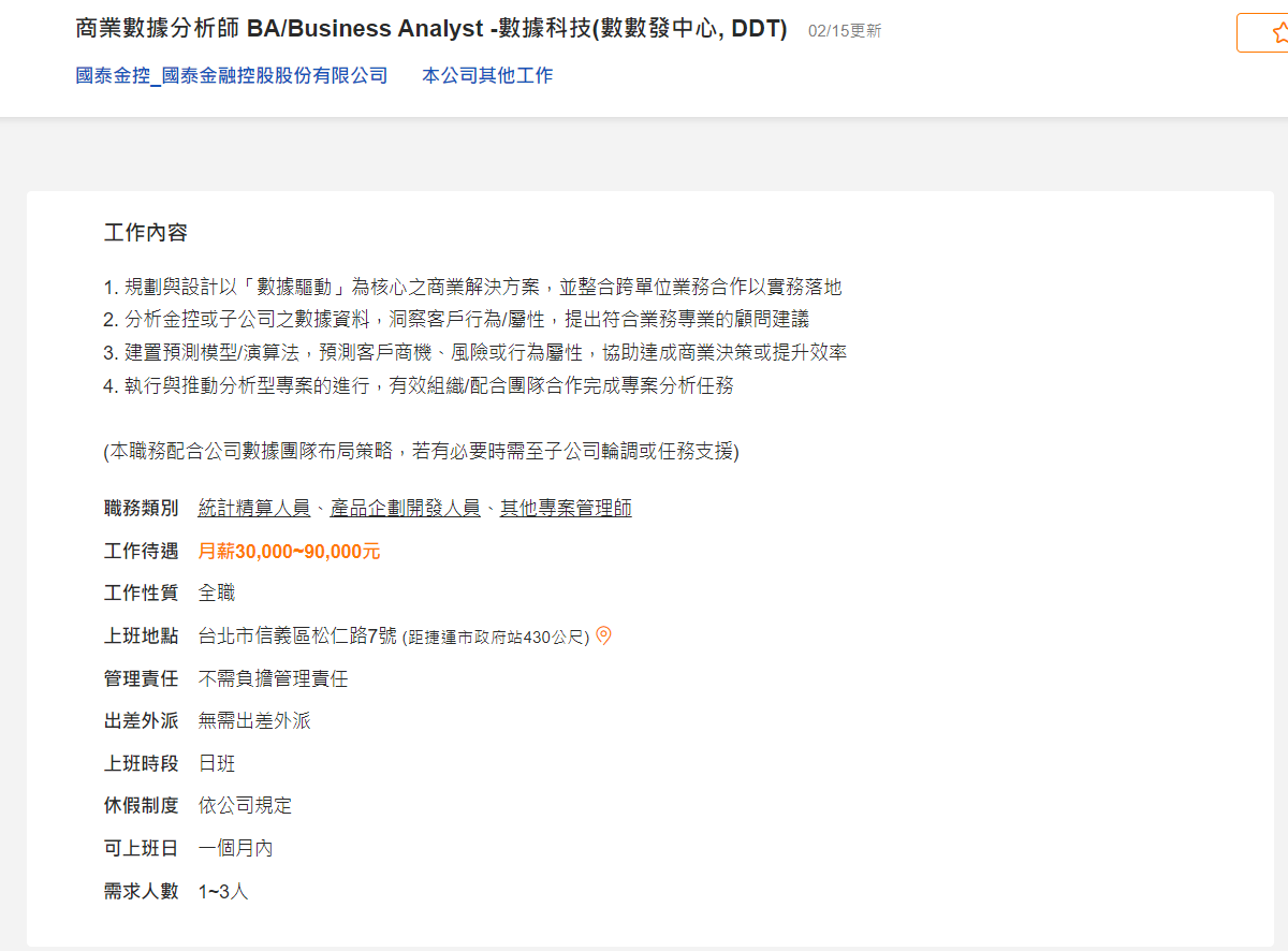 在國泰數數發(Cathay DDT)擔任數據分析師近三年,我經歷快速成長的環境與多變的專案挑戰。本文回顧我從加入數數發的求職決策,到日常工作內容、企業文化,以及最終畢業的心得體悟。如果你正考慮進入金融數據領域,或對數數發的文化好奇,這篇文章將幫助你更清楚地評估是否適合這條職涯道路。