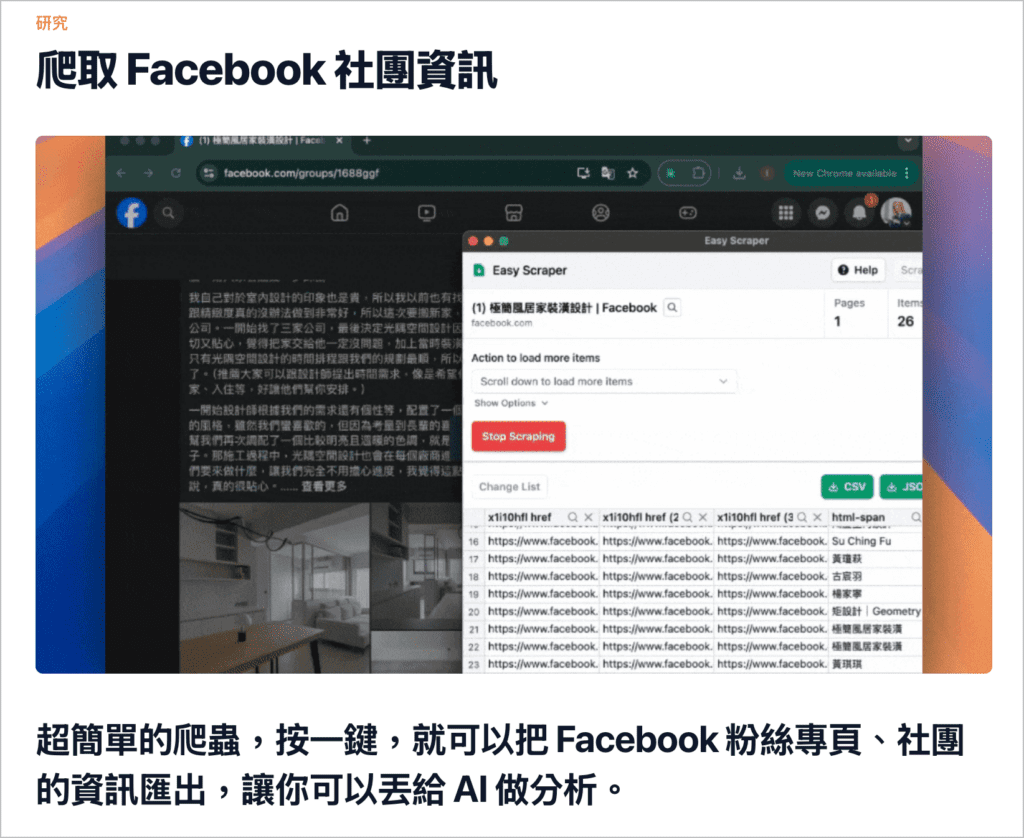 李慕約有寫一篇手把手教學,限定給付費電子報訂閱者/李慕約的 365 AI 訂閱戶,完整閱讀就可以爬取 Facebook ——台灣最多有料內容的資訊。