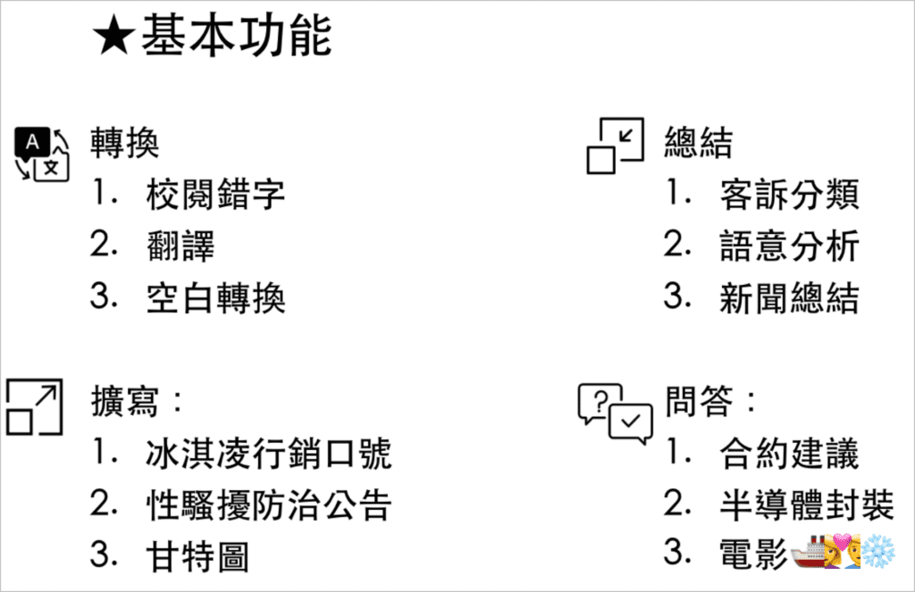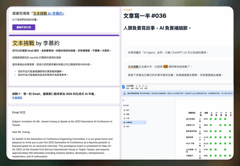 1. 題目設計得很貼近日常生活,從簡單的校稿、翻譯,到比較進階的「撰寫黃仁勳邀請信」,每一題都考驗不同情境對 prompt 的使用判斷。