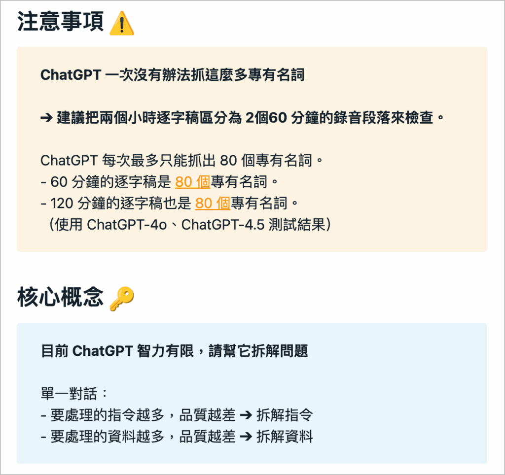 - 需保留專有名詞在逐字稿中原始出現的文字形式(例:逐字稿為簡體字時,請直接保留簡體字)。