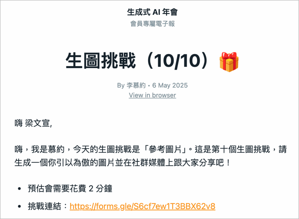 訂閱開跑後幾乎每天都會收到一個「挑戰邀請」,鼓勵讀者「親自下水」玩 AI 。