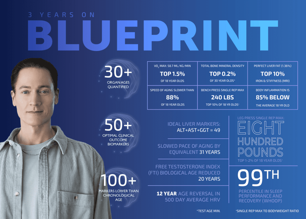 「藍圖計畫」(Blueprint)是由 Bryan Johnson 與再生醫學醫生 Oliver Zolman 與 30 多位醫療專家共同制定的計畫,宗旨非常明確:逆轉衰老,讓身體機能盡量接近 18 歲的水準。