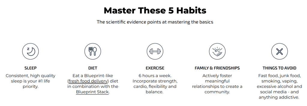 你可以在 Bryan Johnson Free Protocol 看到他針對 5 大習慣的優化建議