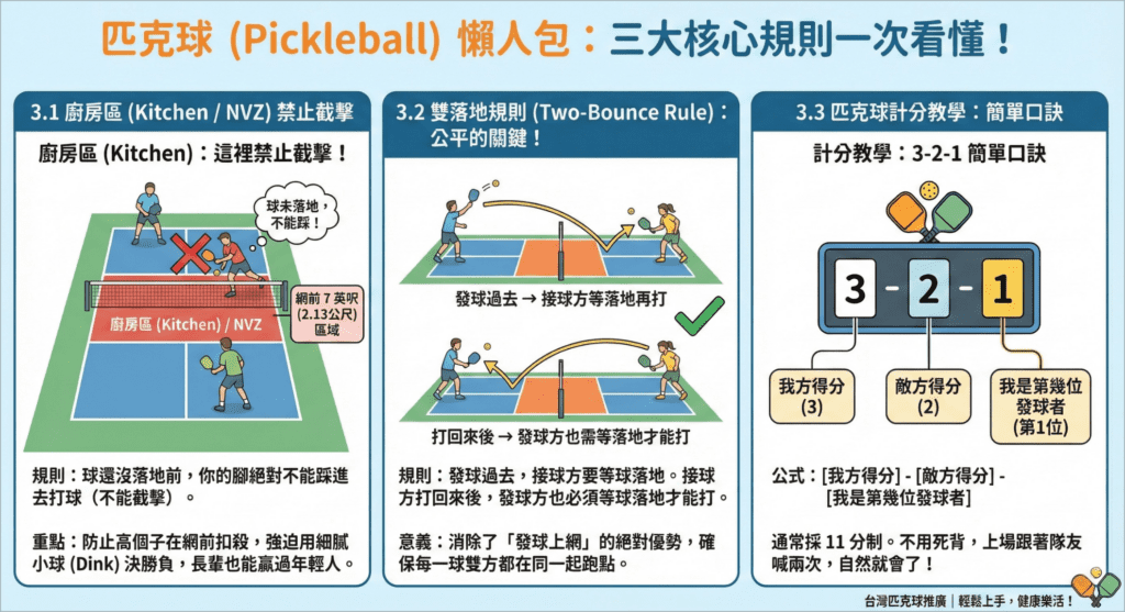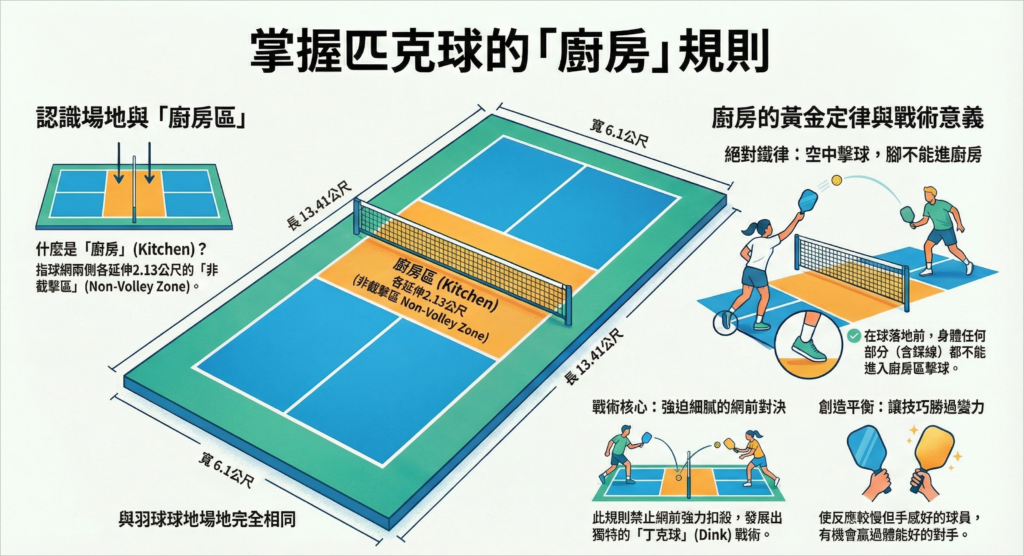 • 戰術意義: 這條規則是為了防止網前無腦扣殺,強迫進行細膩的「丁克球(Dink)」對決,這也是為什麼長輩能靠經驗贏過年輕人的關鍵。