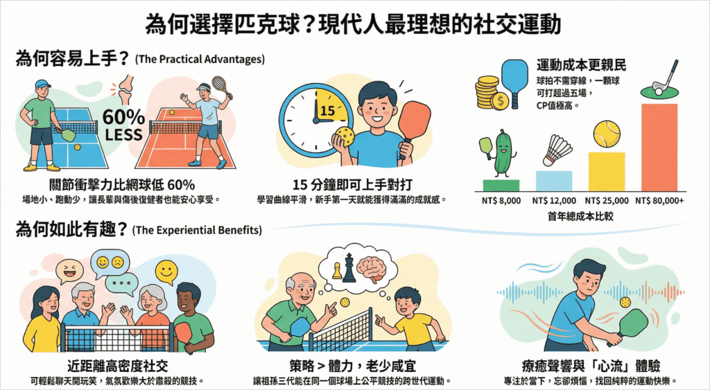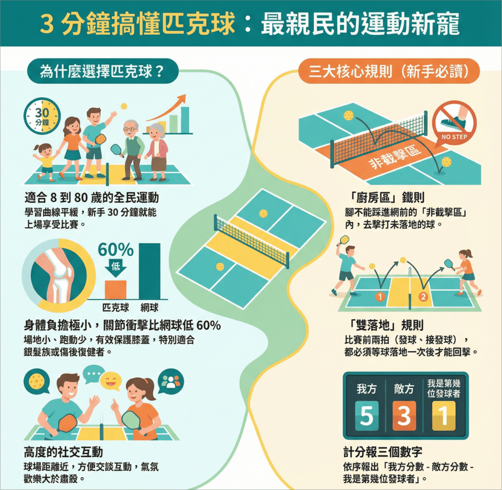 這就是為什麼我寫這篇完整指南——不只給想了解匹克球的你,更是給那些身體開始「提醒」你該換個運動方式的朋友。