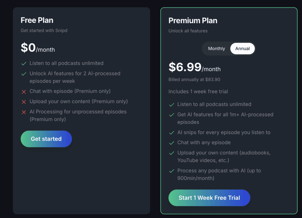 | 上傳有聲書/音檔 | ❌ 不支援 | ✅ 支援 | 【關鍵差異】 如果你想用 Snipd 精讀 Audible 有聲書,這是升級的剛需。 |