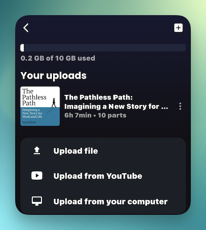 Snipd 的強大之處在於它不僅限於 Podcast。Premium 用戶可以上傳自己的音檔,這意味著你可以將 Audible 有聲書或其他音檔匯入 Snipd,享受同樣強大的 AI 筆記與學習功能。