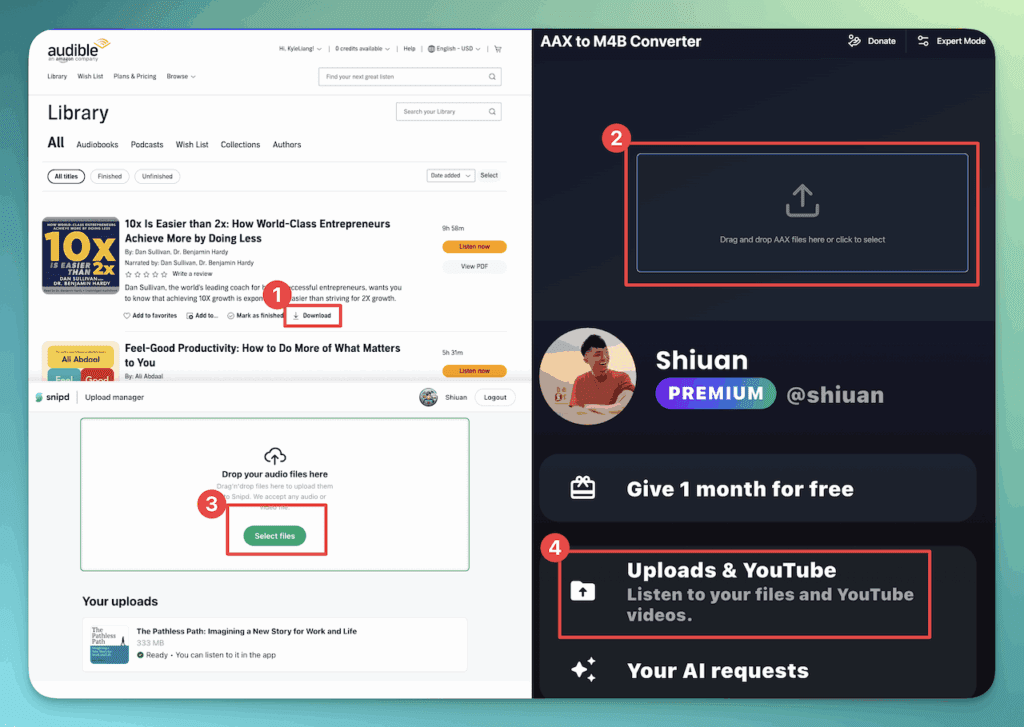 操作上,需要先將 Audible 下載的版權保護檔案(通常是 .aax 格式),使用工具轉換為無 DRM 的 M4B 或 MP3 檔,然後上傳到 Snipd Uploads 區塊。