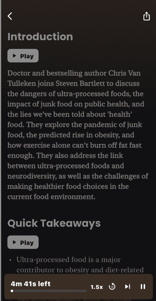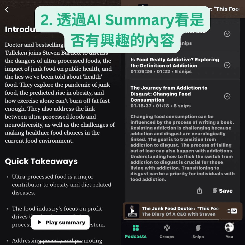 此外,AI 會彙整最多人 Snip 的段落 (Most Snipped highlights),讓你在收聽前,就能先瀏覽整集公認的精華,並且用AI產出 Summary takeaways,讓你可以快速用文字掃描數十分鐘的音檔。