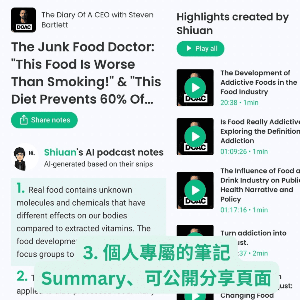 | 個人化 AI 總結 | ❌ 不支援 | ✅ 支援 | 幫助你發現跨節目的知識連結,建構個人知識體系。 |
