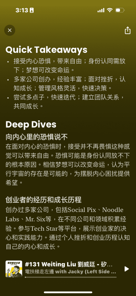 每集會產出10分鐘以內的AI Summary,也可以用音檔播放,讓我快速篩選要不要聽超過1小時的英文訪談