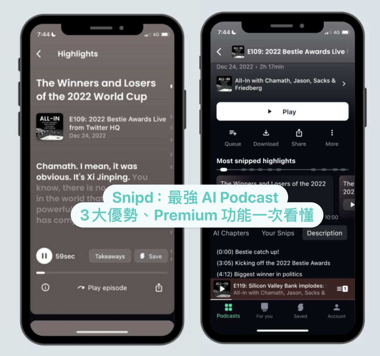 這款應用具有獨特的功能,是允許用戶一鍵 Snipd—— 剪輯重點段落與分享,讓你輕鬆分享節目精彩片段。
