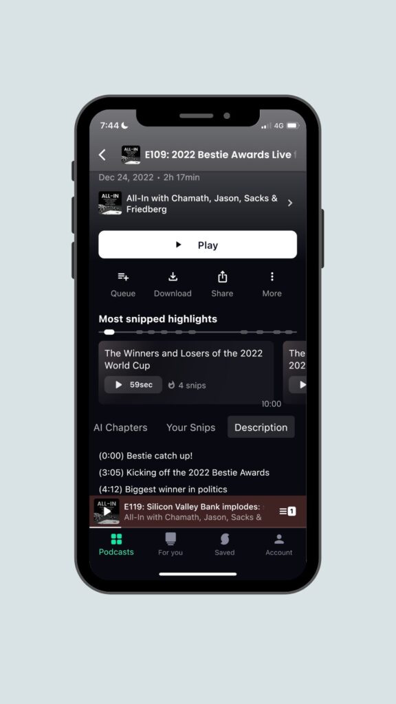 Snipd提供節目的Most Snipped highlights,讓你可以優先聽整個節目的精華