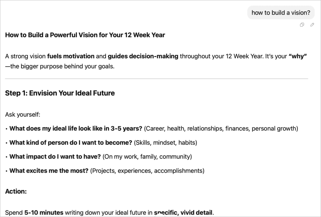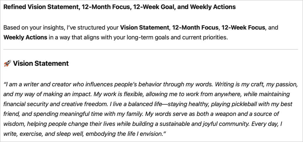 我透過這個 The 12 Week Year GPT – ChatGPT ,幫我規劃好願景、 Vison Satement、關鍵活動,甚至每週活動。