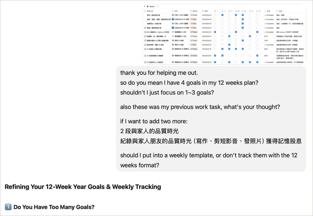 例如,我前述提到家庭與關係在年度目標中被忽略, ChatGPT 對的給出了精準的追蹤建議,例如用一種「輕量化紀錄」的模式去檢查自己本週是否有關注到家庭關係。