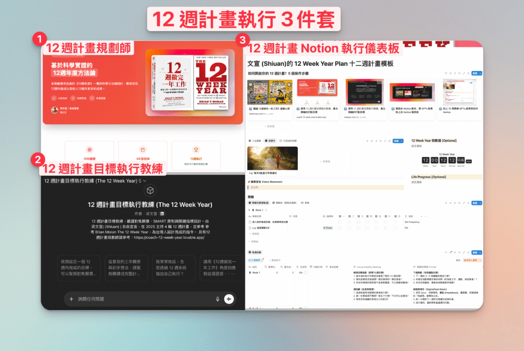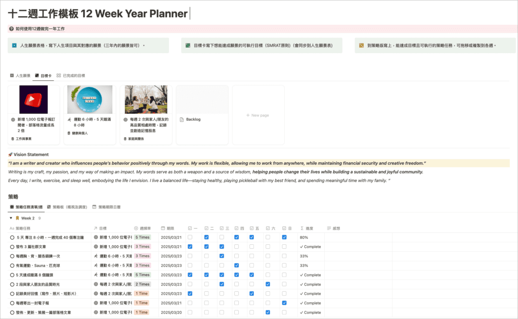 這份 Notion 模板的核心思想呼應《The 12 Week Year》,將目標、行動、評量等要素整合在同一個系統中,