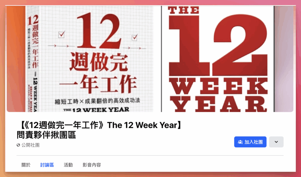 這是《12週做完一年工作》The 12 Week Year 的讀書會交流群,目的是要讓看完這本書,想認真執行 12 週計畫的人,能找到志同道合的問責夥伴,一起在接下來的 12 週往願景邁進。