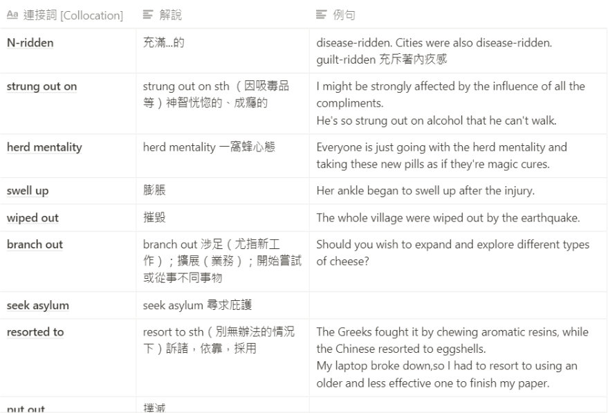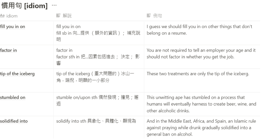 我也把每天學到的新筆記同步在Notion上,跟我的戰友們一起分享今天學到的新的單字、文法、連接詞等。