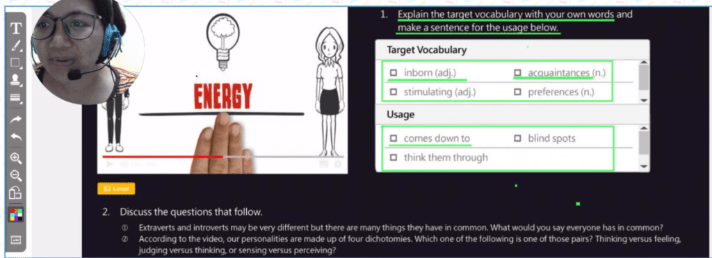 我首先選擇一個有興趣的 VoiceTube Hero 課程影片 (MBTI: Introverted (I) vs. Extraverted (E)) ,並與老師在課程中用英文討論兩者的差異。