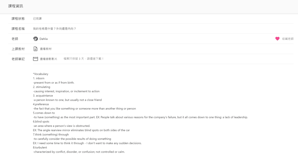 VoiceTube Tutor 1:1 家教老師會在課後提供錄影與筆記