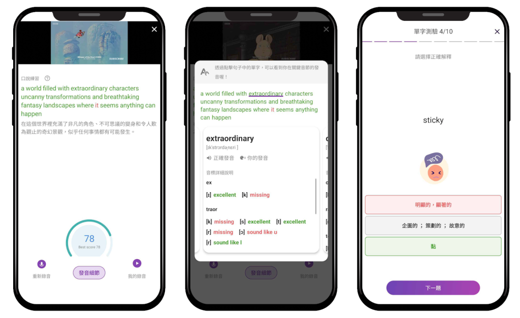 它透過 AI 提供即時回饋,甚至能察覺到細微的發音錯誤,例如母音 A、E 的發音,以及結尾的 s、ed。