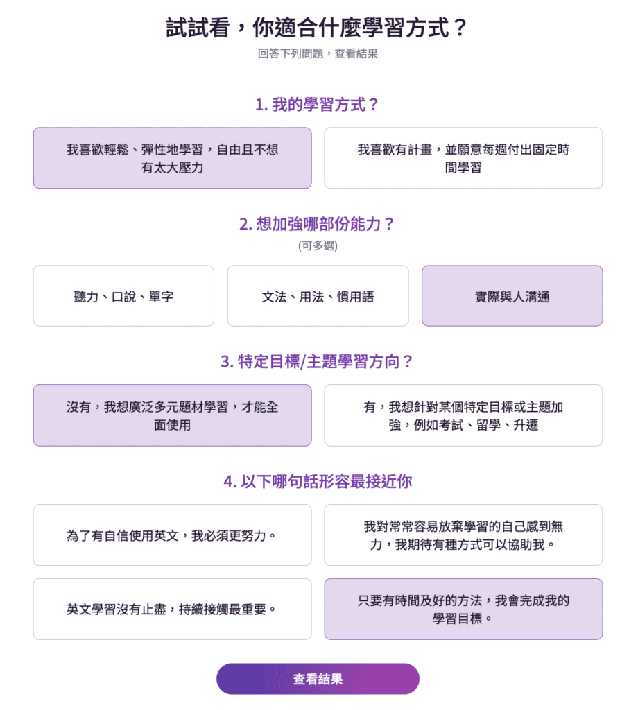 可以試看看 VoiceTube 提供的: 學習類型測驗