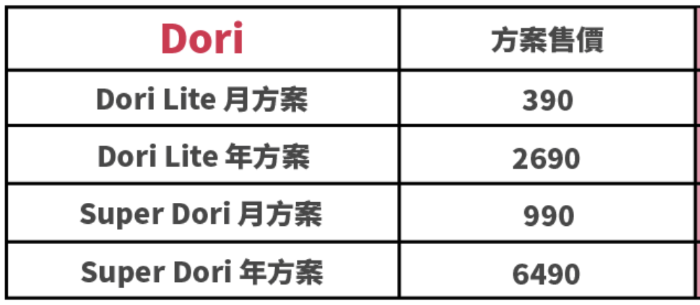 Dori 的方案價格 (2024/ 05 ),使用我的優惠碼 shiuan ,格外享 5 顆會話星星