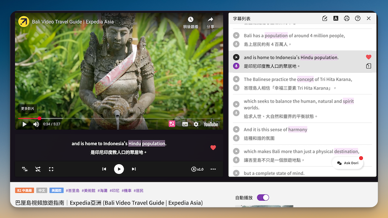• 教學影片內容有趣且實用:取材自 YouTube 熱門影片,主題多元,包括哲學、美食、商業模式等。