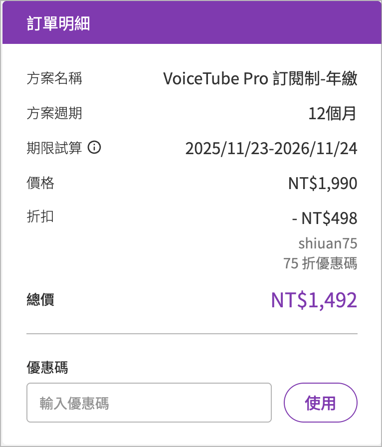 好消息是:不論你選擇哪個方案,包括本篇的重點 VoiceTube Hero 都可以使用我的折扣碼: shiuan75 ,即可獲得 75 折優惠。