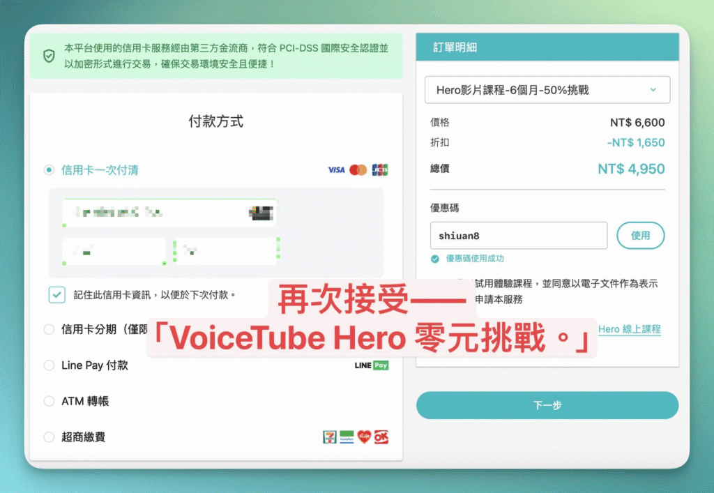 如果你是還在觀望是否要加入 VoiceTube Hero零元挑戰的冒險者,歡迎還在觀望的朋友,可以在 VoiceTube Hero 結帳頁面使用我的優惠碼 shiuan8 可以再打 8 折(視當下優惠活動擇優)。